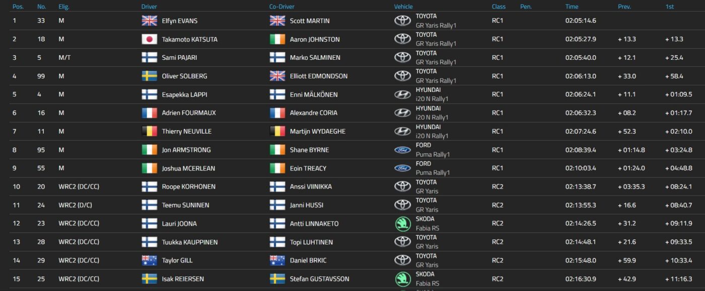 I WRC2 är det topp fyra finländskt med Roope Korhonen följd av Teemu Suninen båda Toyota GR Yaris R2. Lauru Joona Skoda på tredje plats och Tuuka Kaupinen fyra,
